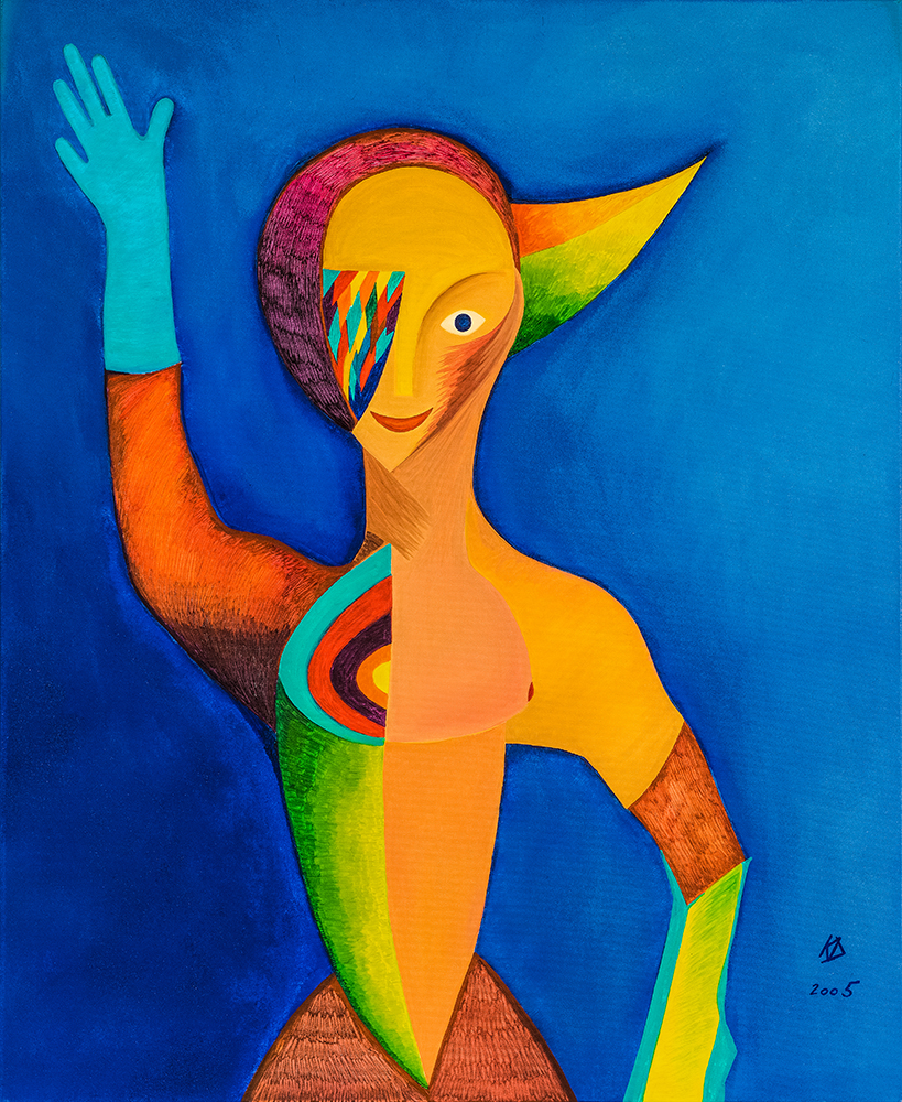 Die Gemälde Katja Duftners zum Thema Maskenmenschen sind scheinbar leicht lesbar, nur scheinbar, denn hinter den optisch nachvollziehbaren Sujets klingt eine reiche Palette von hintergründigen Gedanken und formalen Dualitäten an. Immer wieder wird eine Zweiteilung der Figuration, mit der Abstraktion und Leben, ja Erotik speziell bei den Frauengestalten visualisiert werden, evident. Ein Hell-Dunkel belebt die Raumwirkung, aber auch die Modellierung der Figuren. Statik steht der Bewegung, maskenhafte Starre in der Physiognomie dem Agieren der Arme entgegen; Augen sind archaisch geweitet, und dennoch erscheint das Antlitz leblos. Katja Duftner nimmt nun bewusst eine für sie neue Seinswelt in das Formen- und Motivgut auf. Vorerst dominiert das Treiben der Fasnacht: Der „Zottler“ präsentiert sich in selbstbewusster Pose, stolz auf sein Federkleid, seine Eitelkeit klingt in den Pfauenfedern an, doch im Hintergrund erscheint im Kontrast ein aufgeputzter Mann in weißer Hose, blauer Krawatte und einer Persiflage von Federhut: Der repräsentativ vorgetragene, pompöse Schein trügt also, das Spiegelbild mit ironisierender Statur klingt im Hintergrund als relativierende Wahrheit mit. Schein und Wahrheit werden evident. Augenscheinlich wird dies beim Motiv „Roller und Scheller“, in dem man die Polarisierung von Statik und Bewegung, von Ernst und Ironie, von Archaik und tänzelnder Karikatur deutlich wahrnimmt. Auch die Motive „Scheller“ und „Hexe“ lassen dieses Spiel fühlbar werden. Masken, Kostüme und tradierte Bewegungen wandeln sich wie selbstverständlich zu Attributen der Menschen. Die Akteure sind eingespannt in einen scheinbar undefinierten Raum mit gewölbtem Boden wie einer unsicheren Basis für das angesagte Spiel, in eine Bühne ohne Kulissen, atmosphärisch magisch. Darin wird etwa in den Motiven „Dame“ oder „Auf der Straße“ ein komödiantisches Agieren augenscheinlich: Es ist ein virulentes Spiel der Farben und der Gestik. Ein illustres Gehabe in der maskenhaften Auffächerung des Antlitzes wird augenscheinlich. Ein traumwandlerisches oder frivoles Tanzen lässt die Figurinen wie in einer Commedia dell’Arte szenisch in Erscheinung treten. Das Spiel mit dem Oberkörper entwächst einem Unterleib, der – kegelförmig gebildet – den Drall der Bewegung bereits in sich trägt. Inszenierung ist hier groß geschrieben. Aber Katja Duftner hält sich nicht nur auf der Ebene des Fasnachtstreibens auf, sondern sinniert in ihrer gewohnten Art nach der Allgemeingültigkeit der Ereignisse: Erinnerungen an die Medienwelt, an geschriebene Szenen, die in der Präsentation nur scheinbar natürlich gespielt, in Wirklichkeit nach dem Drehbuch kalkuliert wirken, werden laut. In zwei Gemälden klingt formal die Bindung an die Vernetzungen früherer Arbeiten an: In grafischer Struktur ist das Attribut der „Dame“ beigegeben, das quallenähnliche, durchnervte Wesen im Motiv „Die andere Seite“ wächst aus dem Untergrund auf; Schichten von Unbewusstem werden spürbar, der konstruktiven Gebärde der weiblichen Figurine steht das schwebende florale Gebilde gegenüber: Eine Sehnsucht nach der „anderen Seite“? In der „Lust“ hingegen klingt das Spiel der inneren Kräfte zwischen Mann und Frau an, beide in verlockernder und erwartender Haltung, ab- und zugewandt, statisch und tänzelnd, mit den Armen verhalten und wild agierend, die kristalline Kopfbedeckung ist beiden eigen, die maskenhaften Teile verdecken das Antlitz und dadurch wird die Botschaft der beiden Figuren etwas verschlüsselt. Auch das Motiv der „Verkehrten Welt“ hat etwas Symbolisches in der von Federn geschuppten Lasche vor einem Auge oder in der scheinbar aufgeklappten Brust mit den Schichten wie eine Gesteinsformation.
